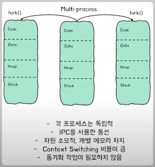 - 프로세스끼리 데이터 통신이 까다롭다. (프로세스는 독립적인 메모리 공간을 가지기 때문)