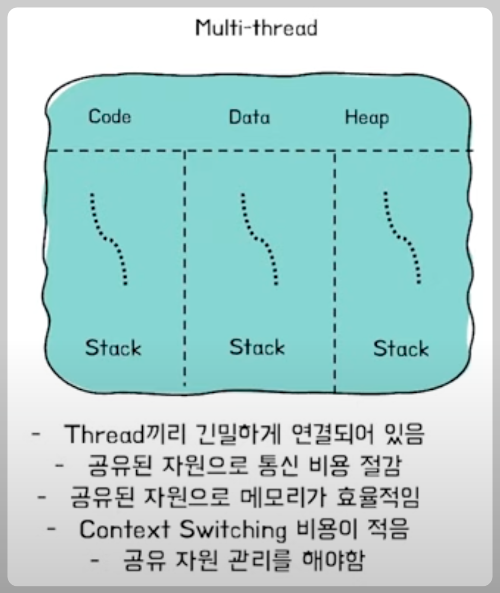 - 메모리 영역(Code, data, Heap)을 공유하기 때문에 메모리가 효율적이고, 같은 프로세스에 있는 스레들끼리 컨텍스트 스위칭 비용이 적으며 통신 비용도 절감된다.