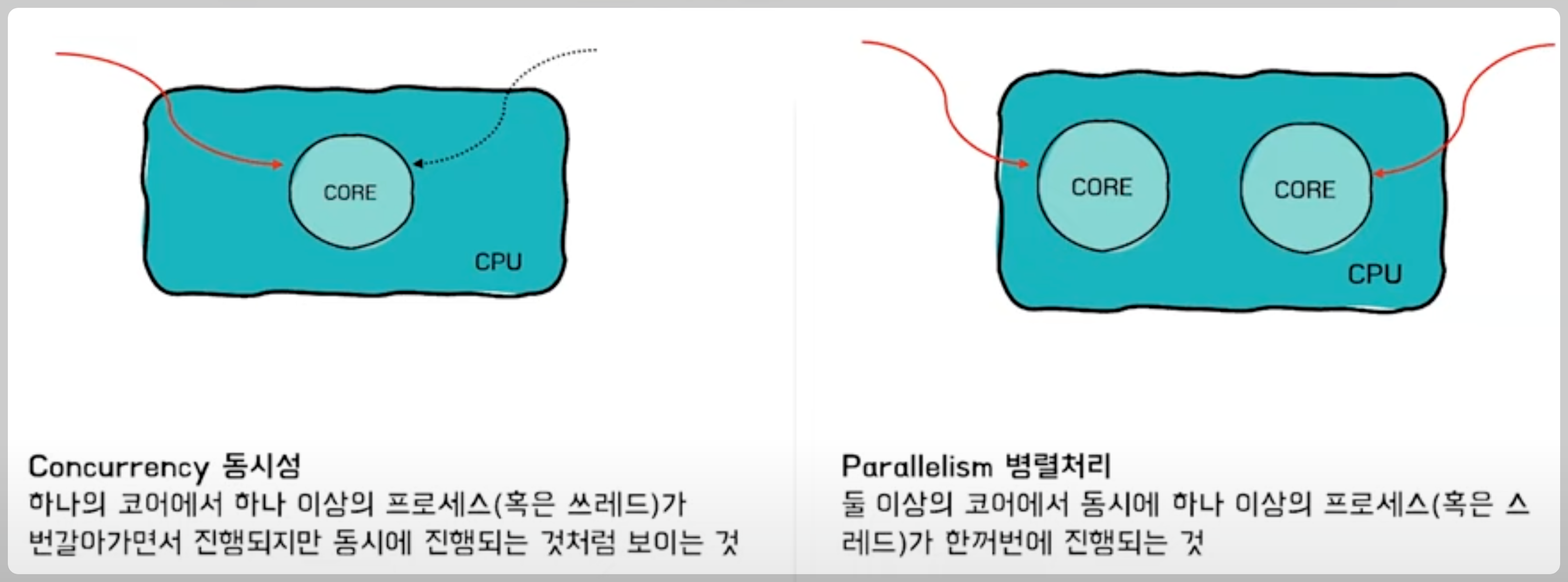 - 두 개 이상의 프로세서(CPU)가 하나 이상의 작업(Task)을 동시에 처리하는 것이다.(병렬처리)