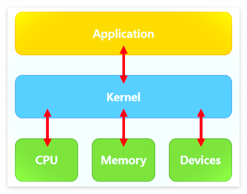 컴퓨터를 구성하는 하드웨어(CPU, Memory, Devices)와 하드웨어를 관리하고 컴퓨터 시스템 전반을 관리하는 OS(커널)가 있고 우리가 개발한 프로그램(Application)은 운영체제를 통해서 하드웨어를 사용하게 된다.