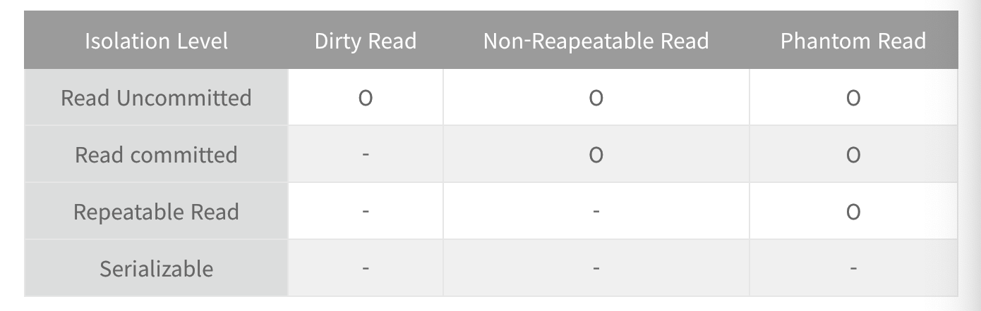Transaction isolation level 종류 및 특징 READ UNCOMMITTED (레벨 0) SELECT 문장이 수행되는 동안 해당 데이터에 Shared Lock이 걸리는 계층 각 트랜잭션에서의 변경내용이 commit 이나 rollback 여부에 상관없이 다른 트랜잭션에서 값을 읽을 수 있다. Dirty Read 발생! 정합성에 문제가 많은 격리 수준이기 때문에 사용하지 않는 것을 권장 READ COMMITTED (레벨 1) SELECT 문장이 수행되는 동안 해당 데이터에 Shared Lock이 걸리지 않는 계층 트랜잭션이 수행되는 동안 다른 트랜잭션이 접근할 수 없어 대기하게 됨 Commit이 이루어진 트랜잭션만 조회 가능 Oracle, SQL Server에서 기본으로 사용 Non-R..